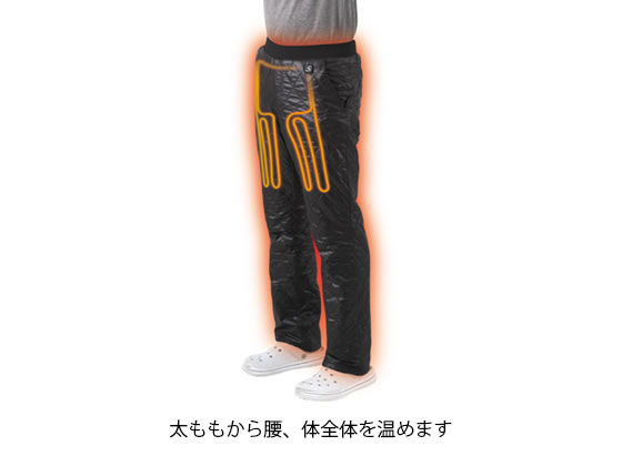 (変換アダプターは別途必要)【検索用キーワード】防寒 防寒着 防寒具 暖房 暖房器具 ヒーター ヒーター付 電熱 遠赤外線 内蔵 付属 パンツ ズボン 防寒ズボン 防寒パンツ 暖房ズボン 暖房パンツ ヒーターズボン ヒーターパンツ バッテリー 充電 充電式 コードレス 即暖 即熱 エコ 節約 省エネ 屋内 屋外 ブラック 黒 くろ クロ L Lサイズ エル エルサイズ 秋 秋物 秋服 冬 冬物 冬服 秋冬 秋冬物 秋冬服 メンズ 男 男性 男性用 レディス レディース 女 女性 女性用 ユニセックス 男女兼用・太もも前面部にヒーター内蔵・3段階に温度調整が可能・充電式で経済的